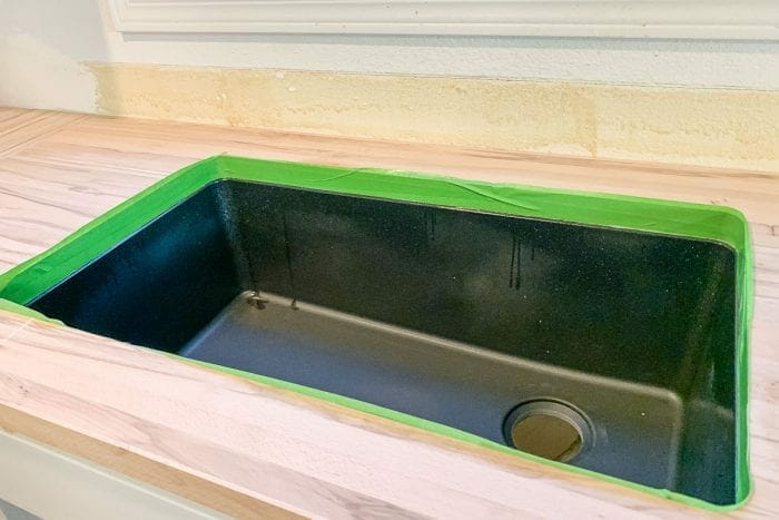 Another trick we learned was to spray the inside of the sink with cooking spray so that the silicone would easily just pull right off from the sink and only remain between the sink and counter.